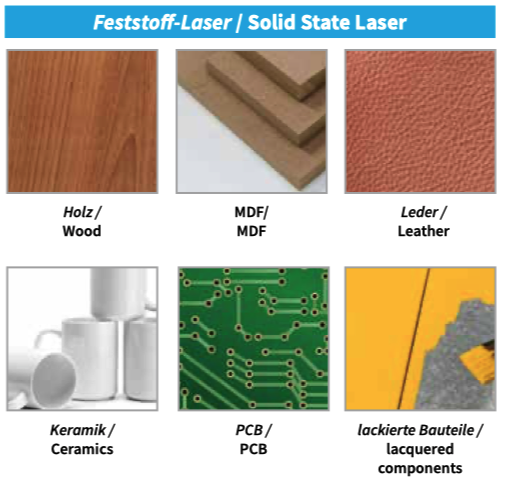 • Breiter Anwendungsbereich: Holz, MDF, Karton, Leder, Keramik, PCB, lackierte Metalle, etc.